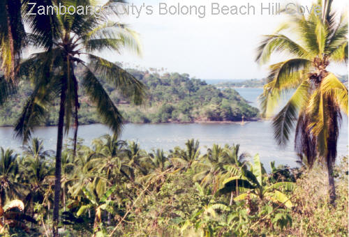 In the foreground of photo is a protective cove saddled along Bolong Beach Hill and barrio Panubigan that is home to the area's lucrative carigeenan (seaweed) farming (notice the numerous white specs on the water), with Bobo Island visible in the distance. (click thumbnail for bigger photo) |