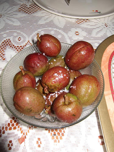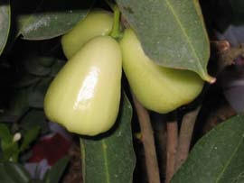 The makopa tree is part of the myrtle or eucalyptus family. The fruit is bell shaped with a waxy skin and comes in pink, white, green and purple. It has a crisp, light (airy or spongy) white pulp that is mild in flavor. I hadn’t tasted makopa for nearly twenty years when during a business trip to Indonesia I noticed one of the office workers eating an intriguing afternoon snack of chopped makopa, green mango, snake fruit, pineapple and other fruits tossed with a chilli and dried shrimp sauce/paste - yum! Makopa is native to the Malay archipelago and it is believed to have been introduced to the Philippines in prehistoric times according to Doreen Fernandezin her book Fruits of the Philippines, who writes that makopa and tambis are interchangeable terms for the same fruit. There appear to be two main types of makopa in the country, I presume one being the smaller variety and the other being the larger variety, hence the addition to Kalabaw (Water Buffalo) to the name of the latter. The tree has now spread to Indonesia, the South Pacific Islands, Hawaii, India, the West Indies and even South America.