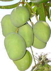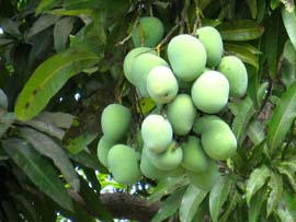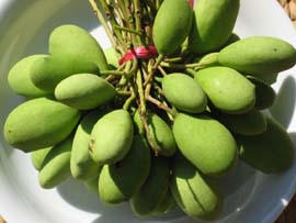 bright morning light. The camias fruits are berries, yellowish-green, lobed