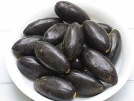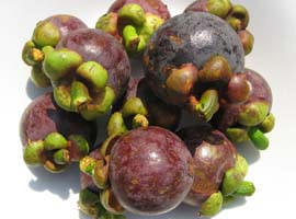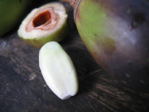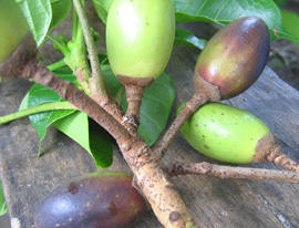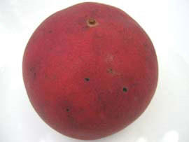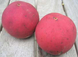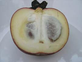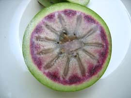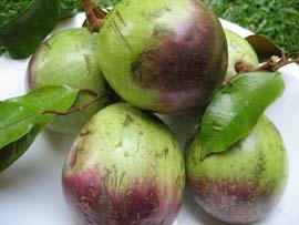 The caimito fruit has a star like design when it is sliced, hence its common name Star Apple. It is native of the West Indies and Central America. Caimito is not grown commercially on a large scale but is mostly appreciated as a fruit tree in home landscapes and along roadsides. A small commercial industry exits in south Florida. The leaves slightly leathery, shiny green on the upper surface and golden-brown on the lower surface. The fruits are delicious as a fresh dessert fruit; it is sweet and best served chilled. It has a soft, extremely sweet flesh that is delicious when cold. The peel may be red-purple, dark-purple, or pale-green. It is smooth, glossy, and leathery. In purple fruits, the inner rind is dark purple, and in green fruits, white. The pulp is white, soft, and milky surrounding 6 to 11 seeds. Generally the fruit is eaten fresh, although it may be an ingredient in fruit salads and sorbets.